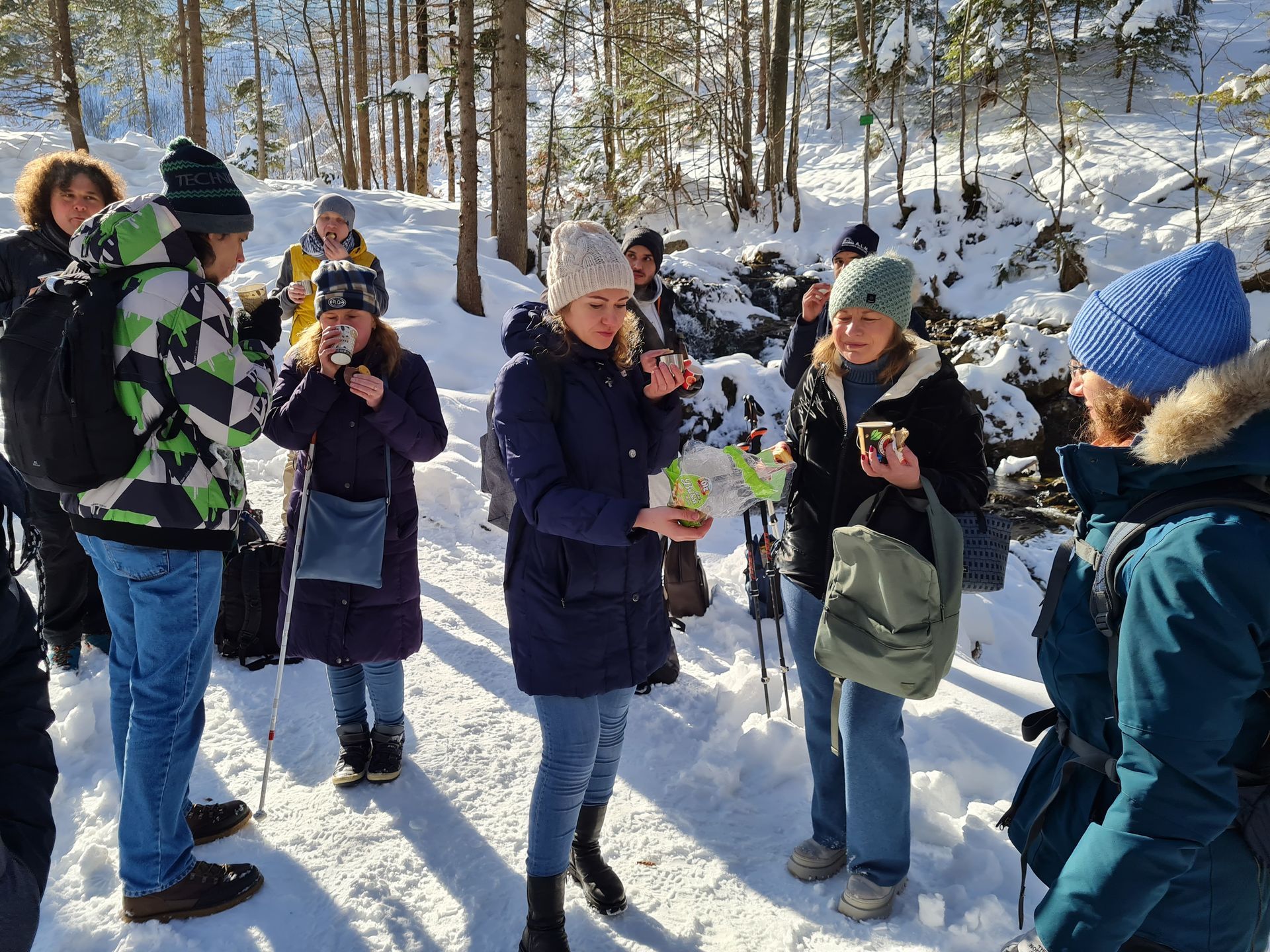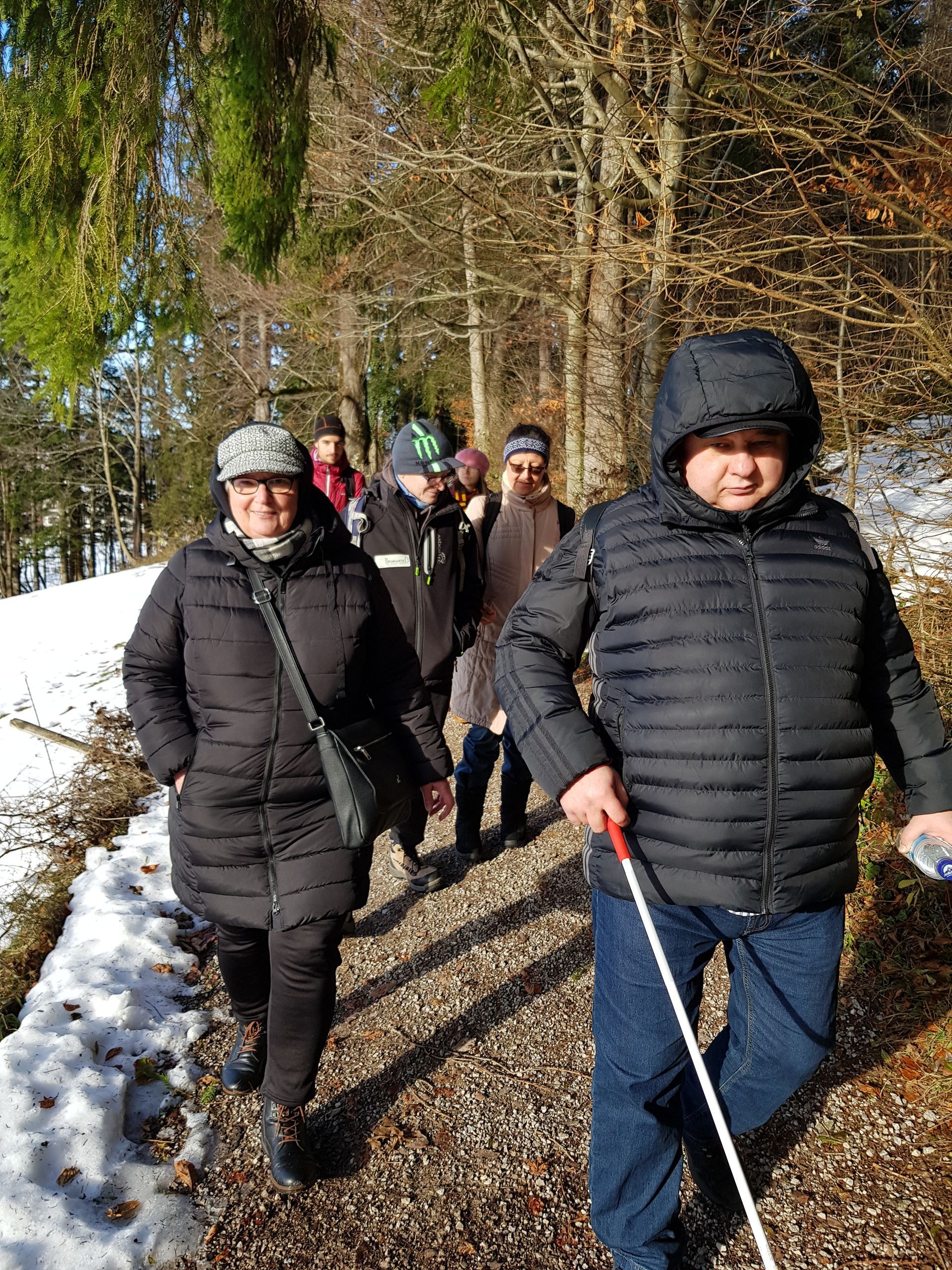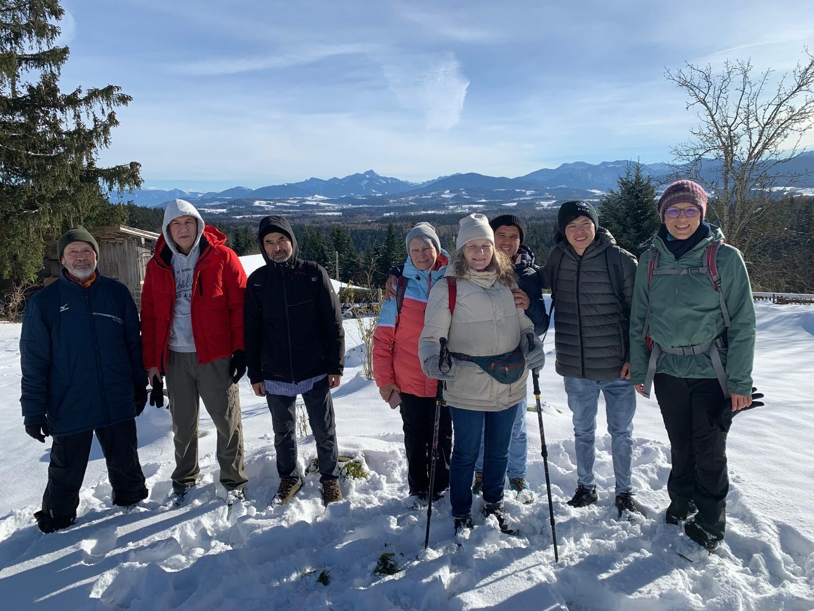 Pulverschnee ist doch wunderbar! Aber es kann auch rutschig werden. Gut, dass immer eine helfende Hand da ist! Und spätestens beim Teilen der Brotzeit kommen alle miteinander ins Gespräch. Es waren wieder viele unterschiedliche Nationen dabei und Menschen mit einer Behinderung. Auch eine blinde Teilnehmerin mit ihrem Partner mit Sehbehinderung, haben die Wanderung hervorragend gemeistert.