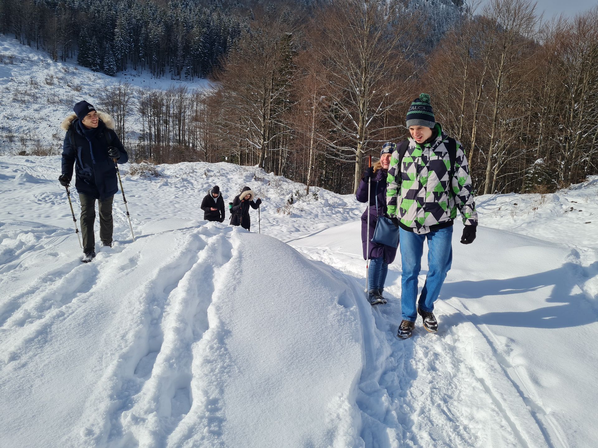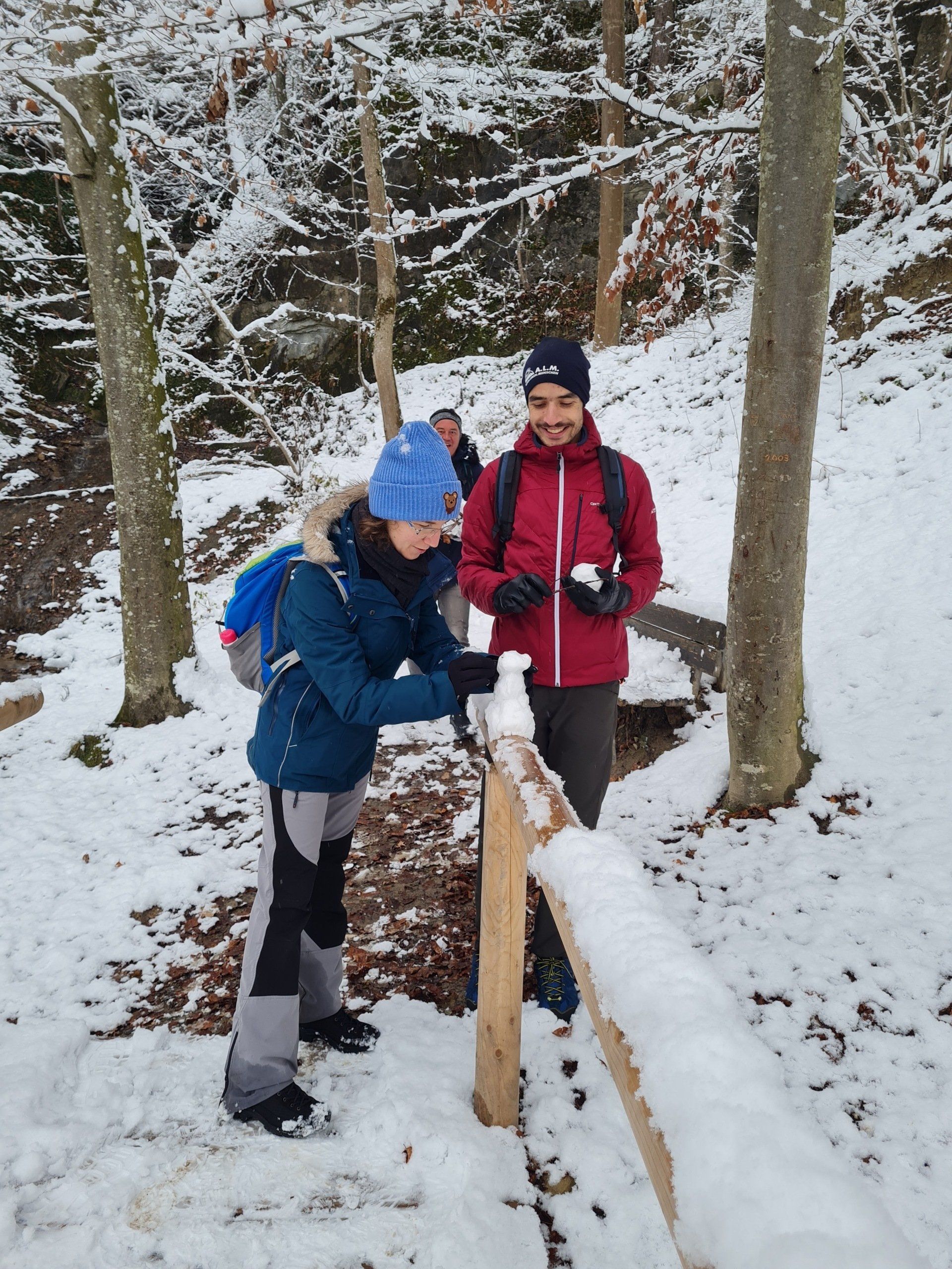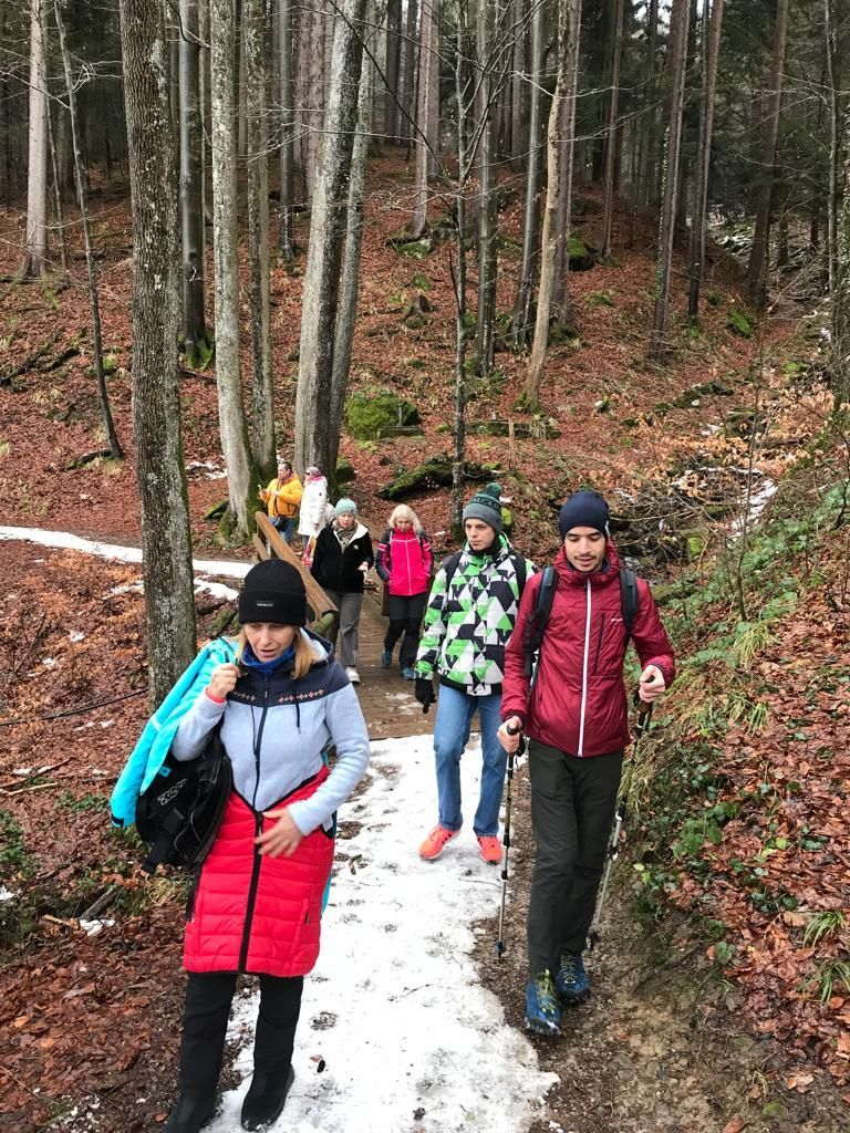 Pulverschnee ist doch wunderbar! Aber es kann auch rutschig werden. Gut, dass immer eine helfende Hand da ist! Und spätestens beim Teilen der Brotzeit kommen alle miteinander ins Gespräch. Es waren wieder viele unterschiedliche Nationen dabei und Menschen mit einer Behinderung. Auch eine blinde Teilnehmerin mit ihrem Partner mit Sehbehinderung, haben die Wanderung hervorragend gemeistert.