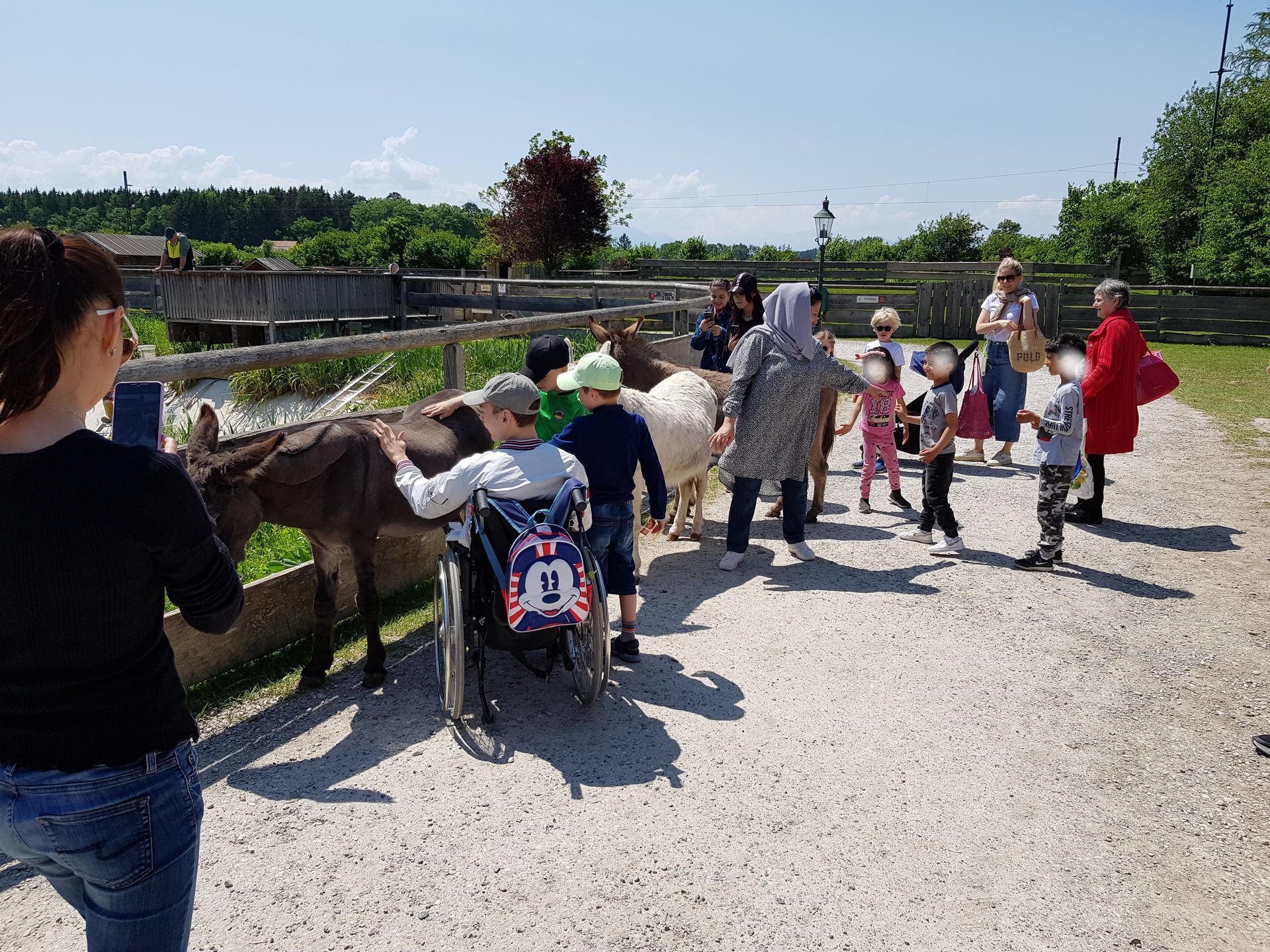 Geflüchtete Familien genießen einen Tag im Gut Aiderbichl