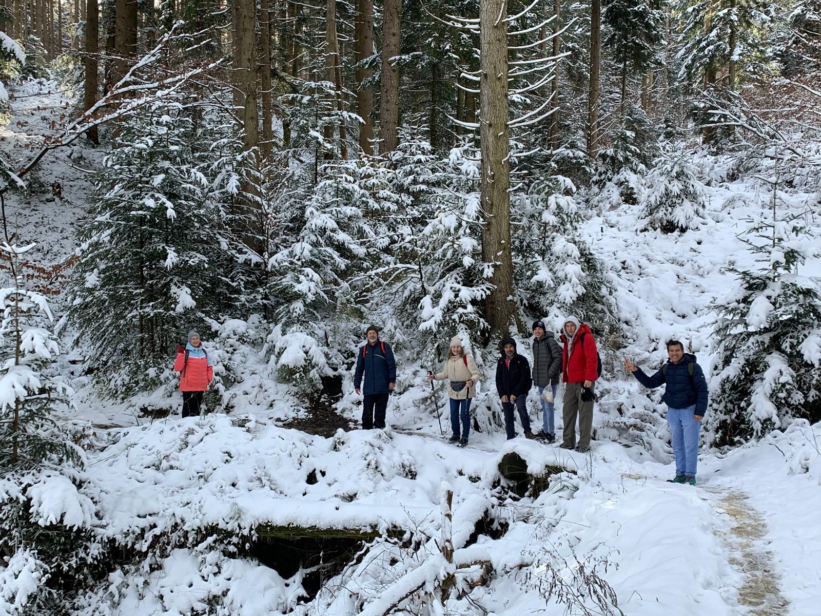 Pulverschnee ist doch wunderbar! Aber es kann auch rutschig werden. Gut, dass immer eine helfende Hand da ist! Und spätestens beim Teilen der Brotzeit kommen alle miteinander ins Gespräch. Es waren wieder viele unterschiedliche Nationen dabei und Menschen mit einer Behinderung. Auch eine blinde Teilnehmerin mit ihrem Partner mit Sehbehinderung, haben die Wanderung hervorragend gemeistert.
